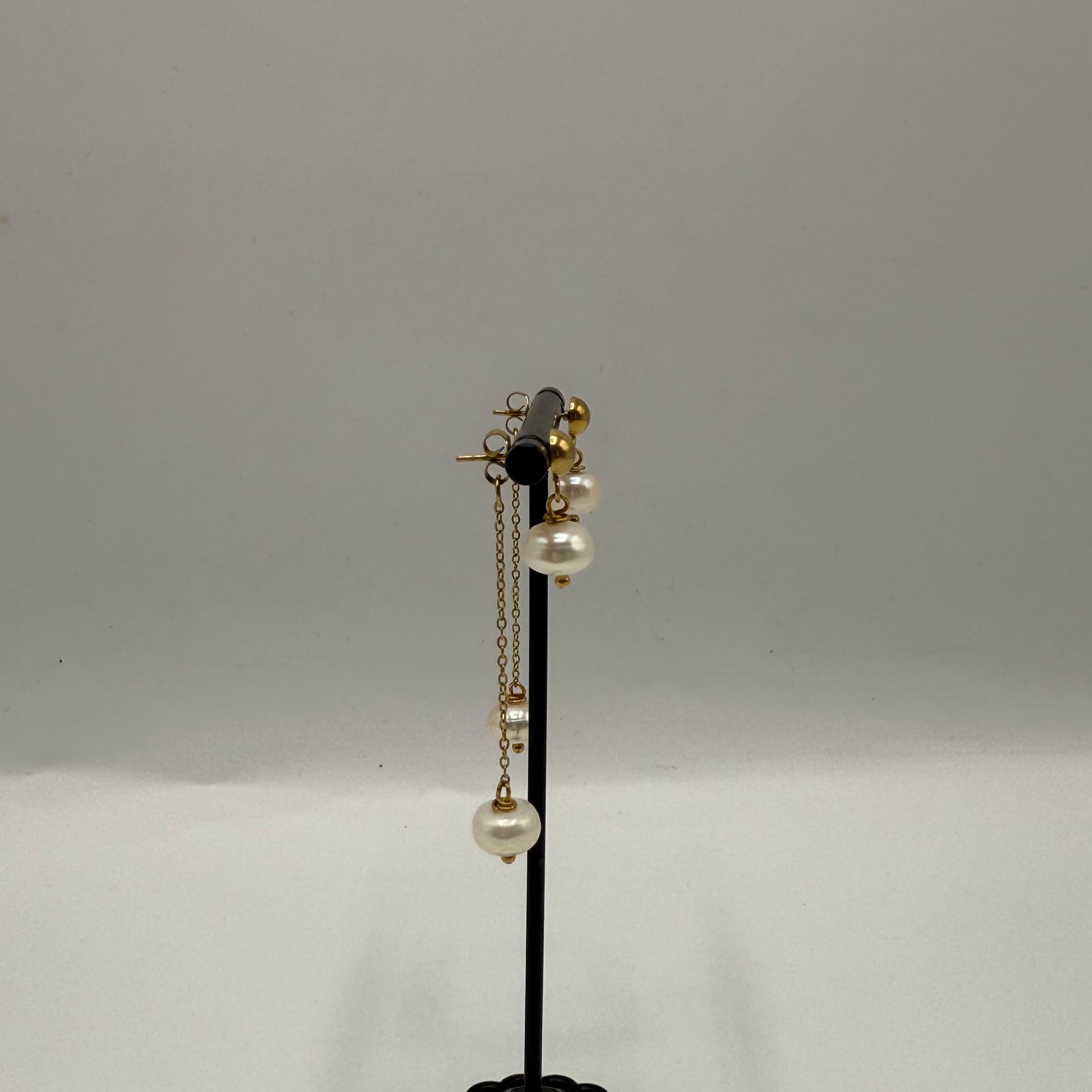 Boucles d’oreilles pendantes fines et délicates, composées d’une chaînette dorée en acier inoxydable et de deux perles d’eau douce en cascade.