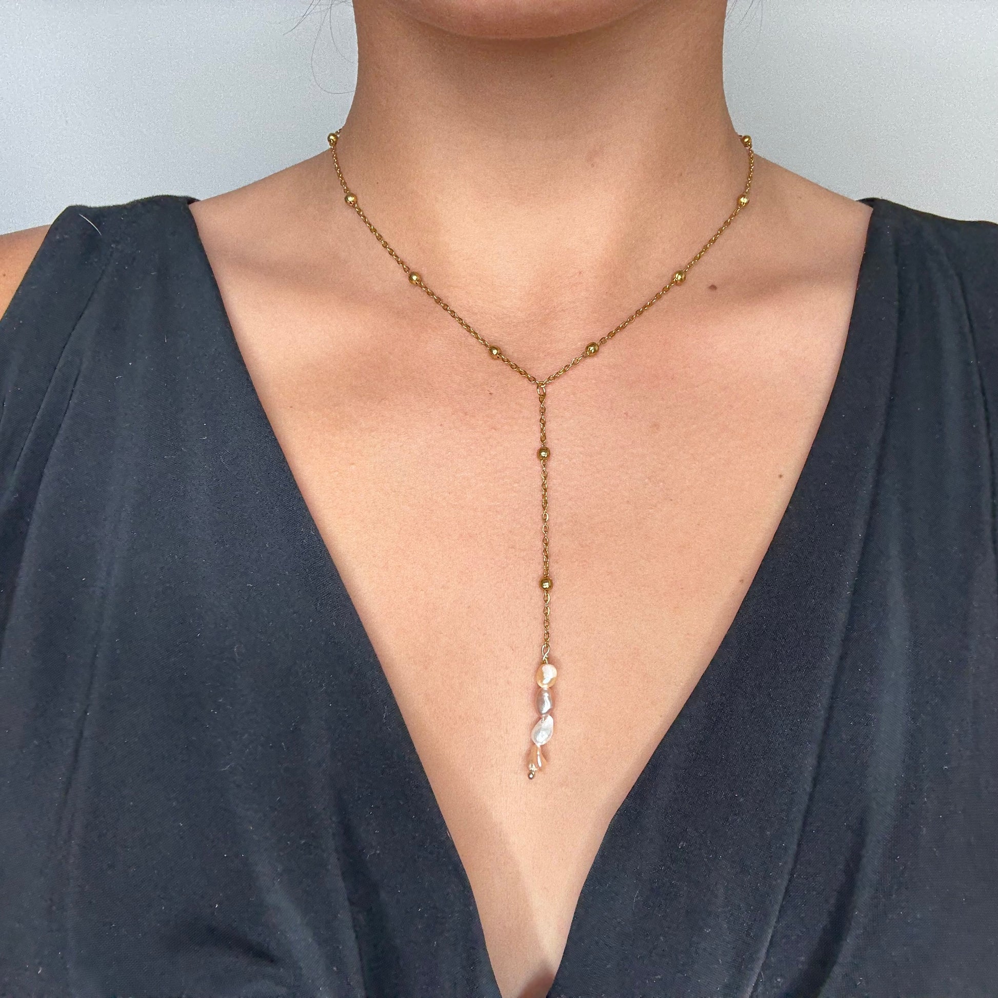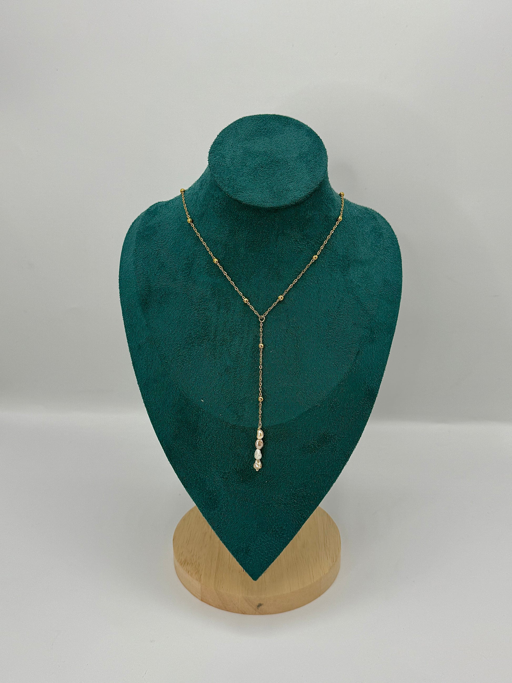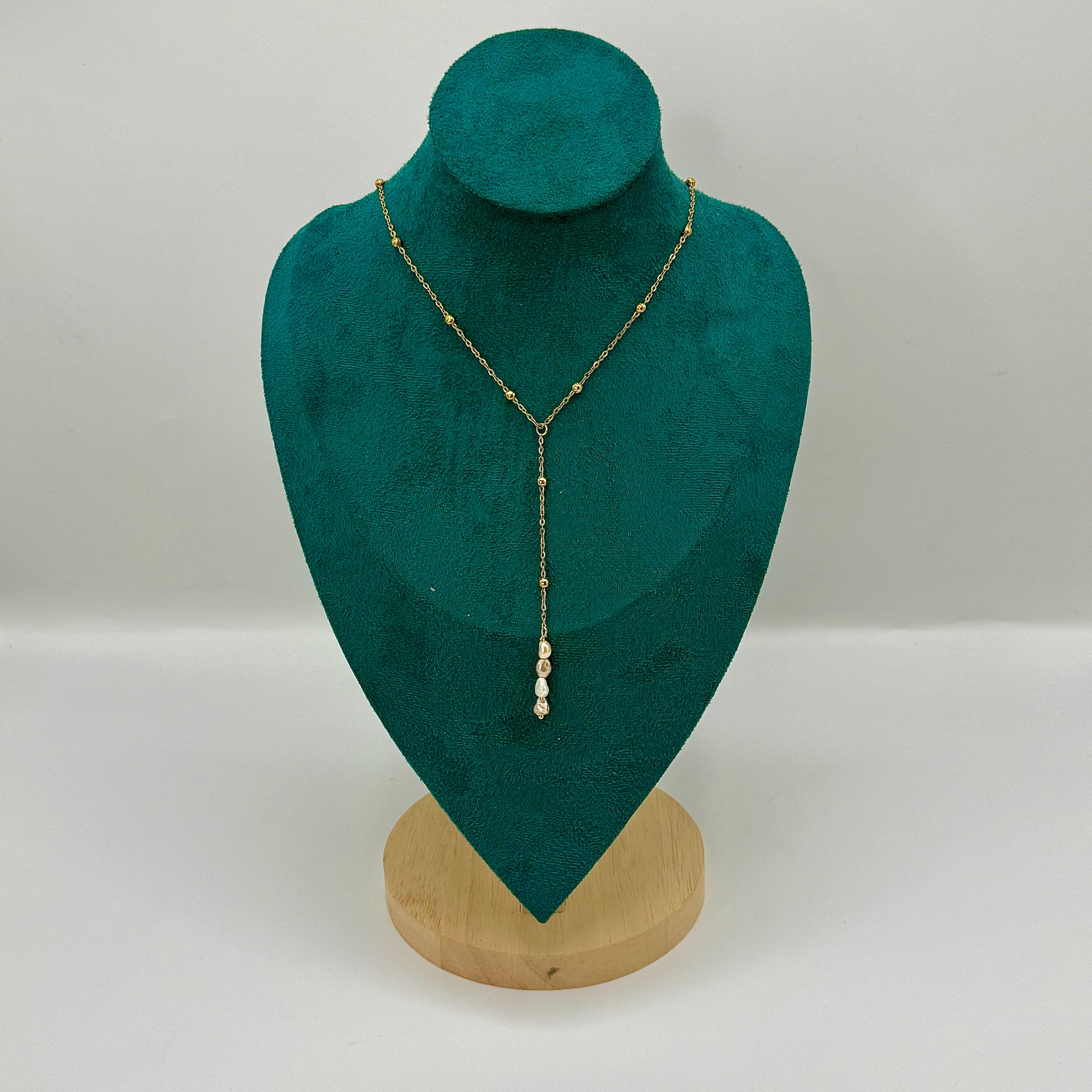 Sublimez votre décolleté avec ce collier raffiné en acier inoxydable doré, orné de trois perles d’eau douce naturelles. Sa forme en Y élancée met en valeur le cou tout en finesse, pour un look chic et minimaliste.✨