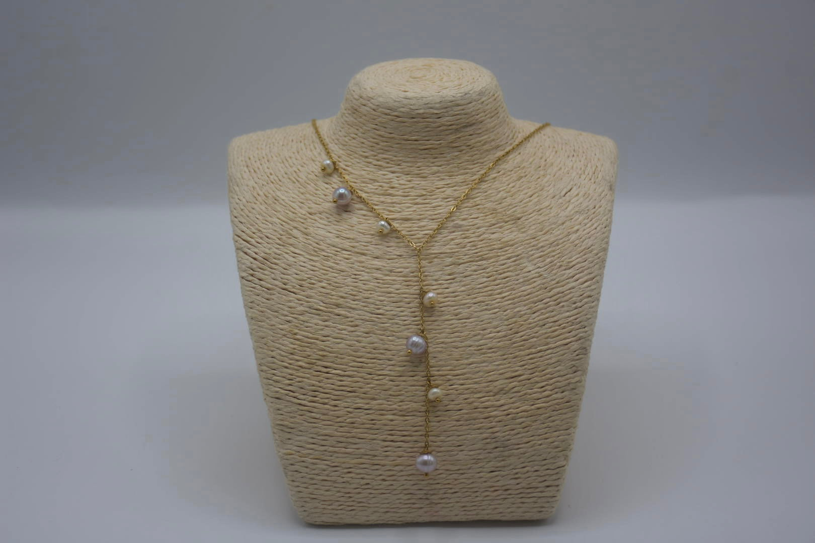Collier doré en Y orné de perles d’eau douce aux reflets nacrés.