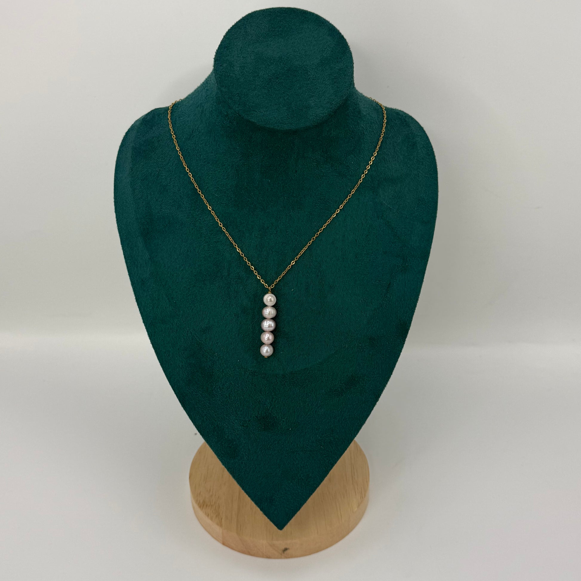 Collier doré orné de cinq perles d’eau douce aux reflets rose pâle. Un bijou féminin et délicat qui capte la lumière avec douceur. 🪻✨