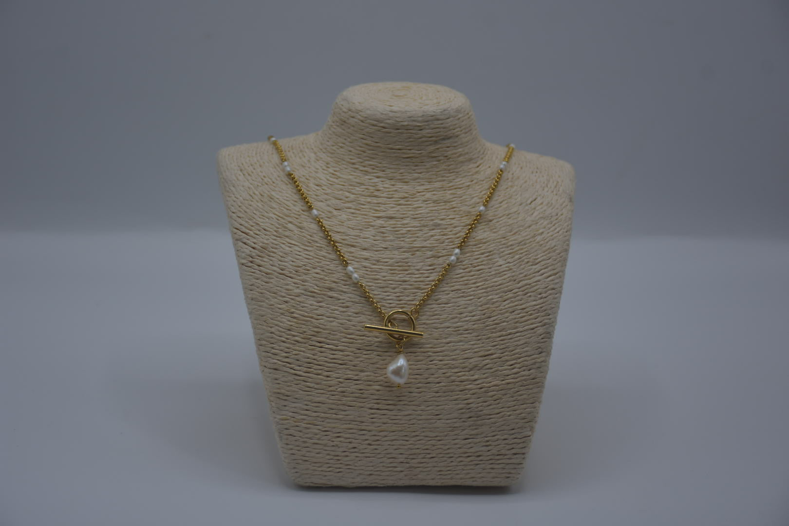 Collier doré orné de petite perles d’eau douce sur sur la chaîne et d’un pendentif en forme de goutte nacrée suspendue au fermoir toggle.