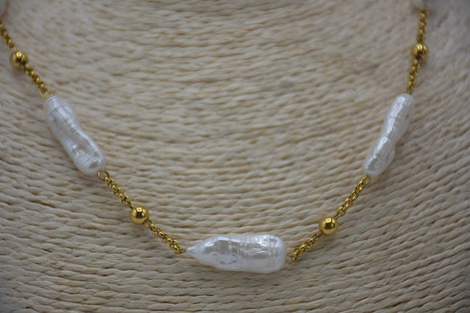 ✨ Collier raffiné composé de perles d’eau douce baroques et de perles dorées en acier inoxydable.