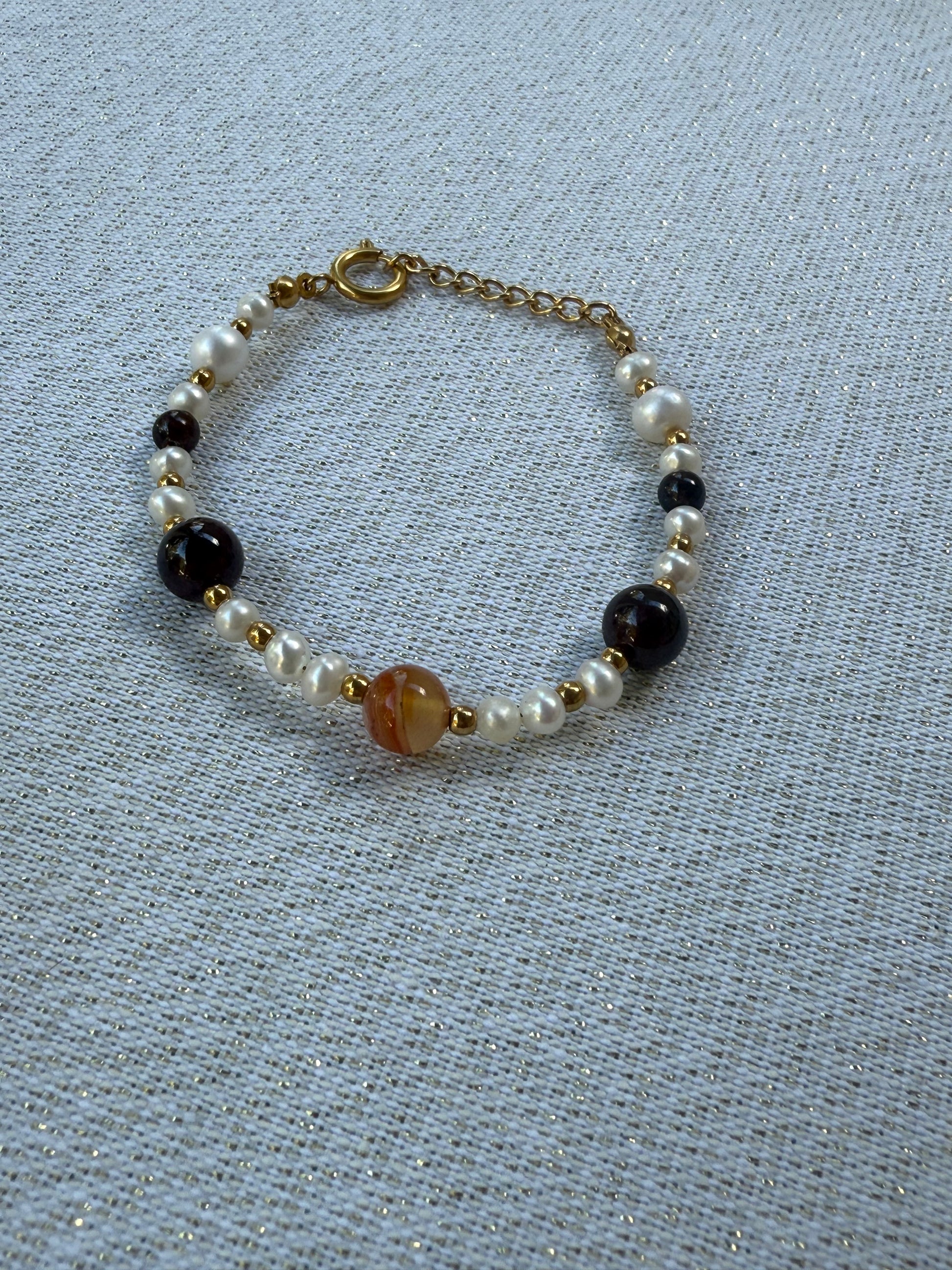 Ce bracelet délicat associe l’élégance des perles blanches d’eau douce à la puissance des pierres semi-précieuses :